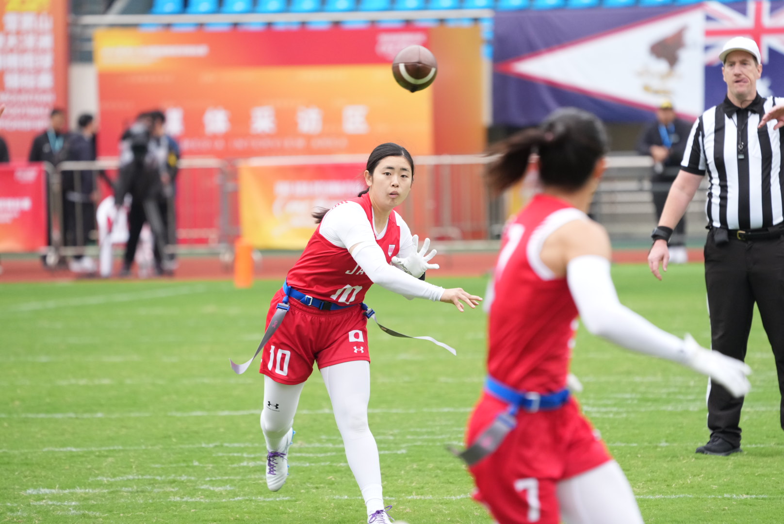 女子の日本は中国戦の前半、QB磐田千紘(カンザスウェズリアン大学)がWR近江佑璃夏(東京ヴェルディ・ローゼス)にタッチダウンパスを決めて6点を先制。前半終了間際に再び近江がTDパス捕球して18-6とリードすると、続く中国の攻撃で森永瑚雪(シグナス・トウキョウ)がセーフティーで2点を奪って突き放すなどし、8月のワールドゲームズ(中国・成都)で敗れた雪辱を果たしました。