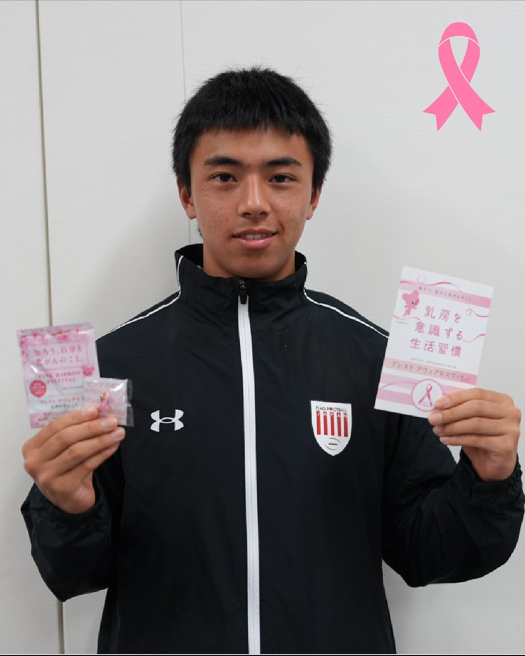 フラッグフットボールJAPANでは、公益財団法人日本対がん協会のご協力の下、今月11日から3日間行った強化練習で、選手とスタッフにピンクリボンバッジやブレスト・アウェアネス(乳房を意識する生活習慣)啓発冊子などを配布。乳がんに対する知識を深めるとともに、ピンクリボン運動への意識を高めました。