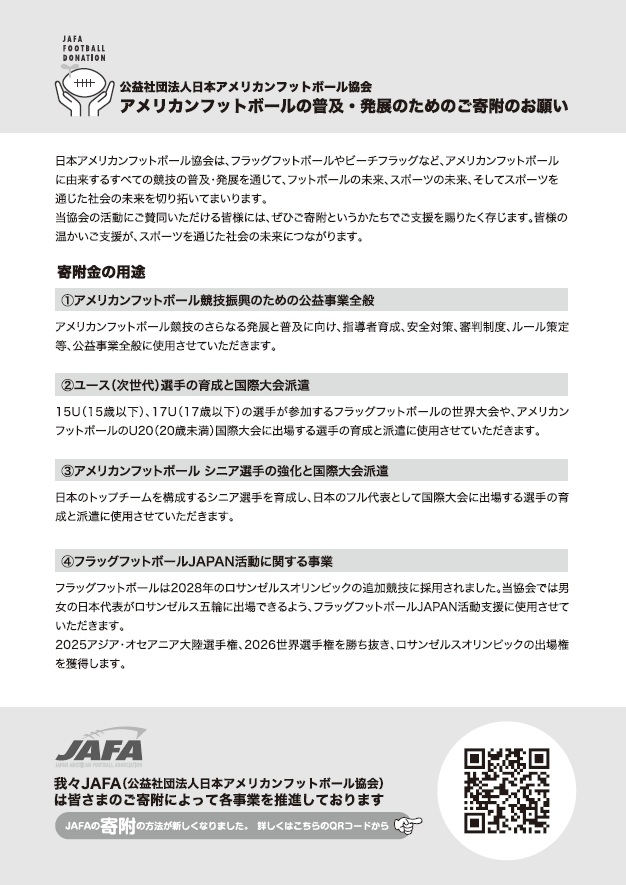 公益社団法人日本アメリカンフットボール協会は、フラッグフットボールやビーチフラッグなど、アメリカンフットボールに由来するすべての競技の普及・発展を通じて、フットボールの未来、スポーツの未来、そしてスポーツを通じた社会の未来を切り拓いてまいります。