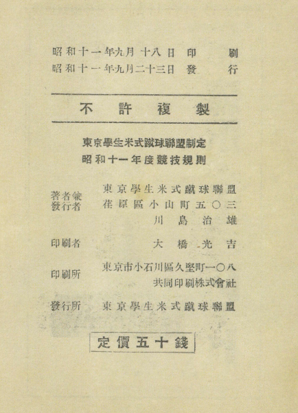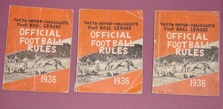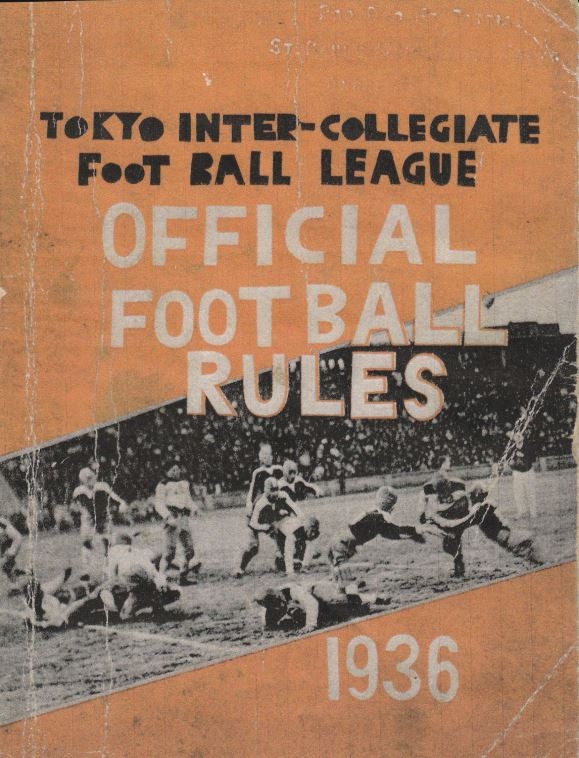 日本の最初のアメリカンフットボール公式規則書は、初めての公式試合が開催された1934年(昭和9年)から2年後の1936年(昭和11年)9月23日に発行されました。日本フットボール3年目のこの年、リーグ戦の開幕試合は10月24日(土)19時30分試合開始の「明治大-慶応義塾大」(於:芝公園競技場)でしたが、この開幕試合に間に合う発行がされています。