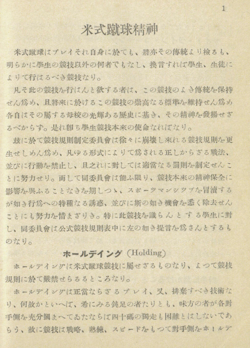 下はこの公式規則書の冒頭に記載されている「一.米式蹴球精神」全3頁の最初の頁です。